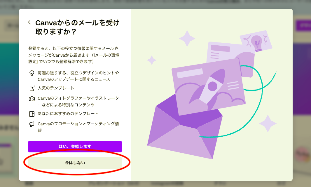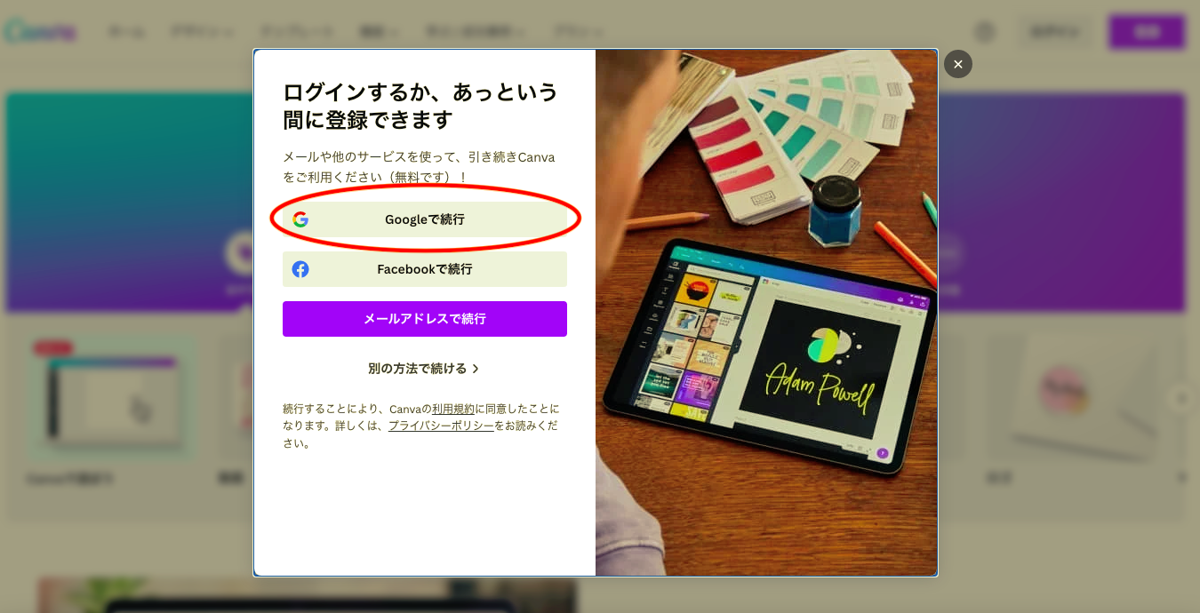 Canvaのトップ画面にログインした状態のページに自動で飛ぶので、そのページをブックマークしておくと便利です。
