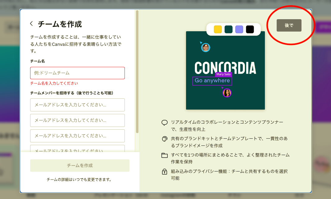 チームを作成することもできますが、とりあえずしないので「後で」をクリック