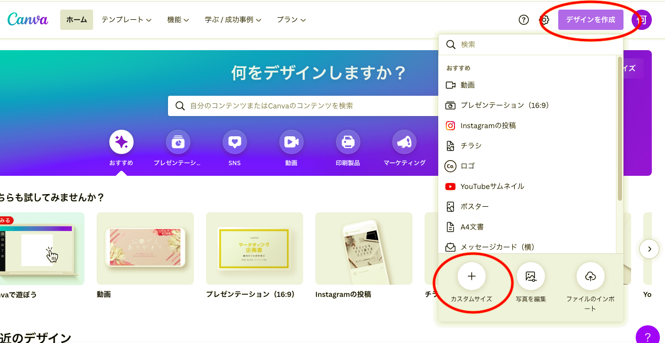 右上の「デザインを作成」をクリックし、ドロップダウンメニューから作りたい画像の種類を選びます。