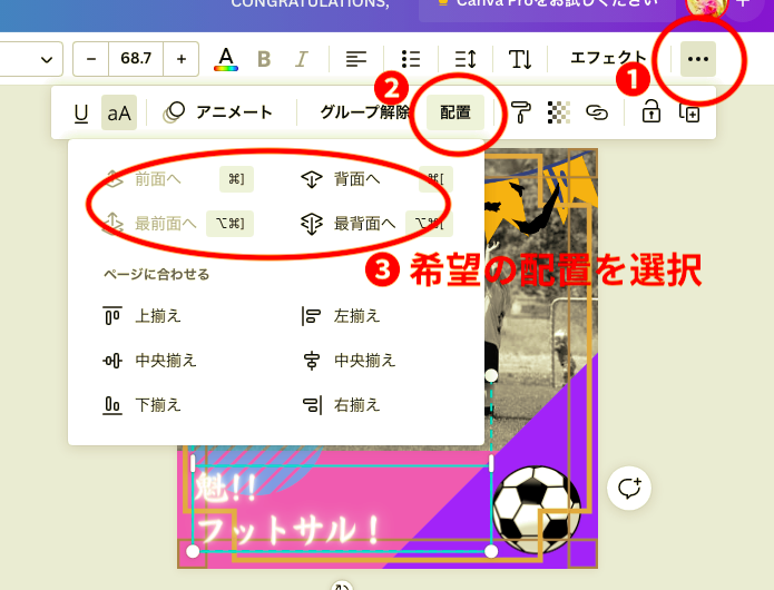 例えば、今、画像が文字の下になってるけど画像の方を上にしたい、などという場合、動かしたいオブジェクトを選択してから、下記の順にクリックして配置を変更できます。